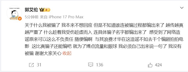 @郭艾伦 刚刚在微博发文澄清“被诈骗”一事:关于什么我被骗了 我本来不想回应 但是不知道谁连被骗过程都编出来了 越传越真越严重了 什么趁着我受伤趁虚而入 连具体骗子名字都编出来了 感受到了网络造谣原来可以这么不负责任 随便编啊 与其浪费才华在这造谣不如去干个编剧拍拍电影 这比真骗子还能编吧 就为了博点流量和眼球 我必须自己出来说一句了 我没有被骗 谢谢大家关心